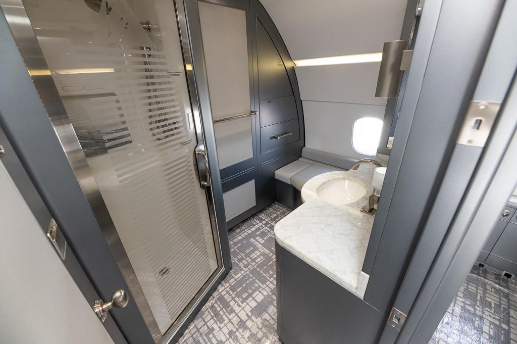 Each of the two bedroom suites on the Opus Aero BBJ features a private lavatory with shower.