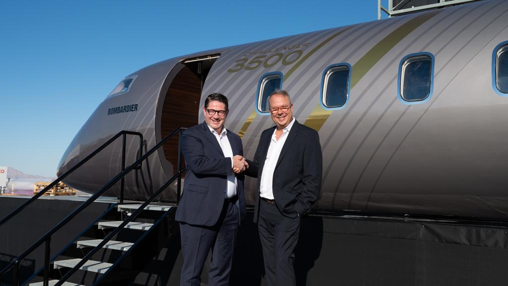 Eric Martel, President and CEO, with Peter Likoray, Senior VP of Sales in front of Bombardier 3500 Mockup. Photo: Brett Schauf/ShowNews