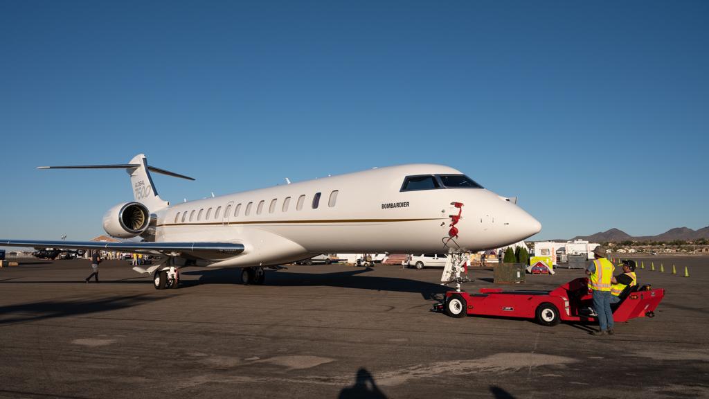 Bombardier 7500 being pushed into position for static display. Photo: Brett Schauf/ShowNews