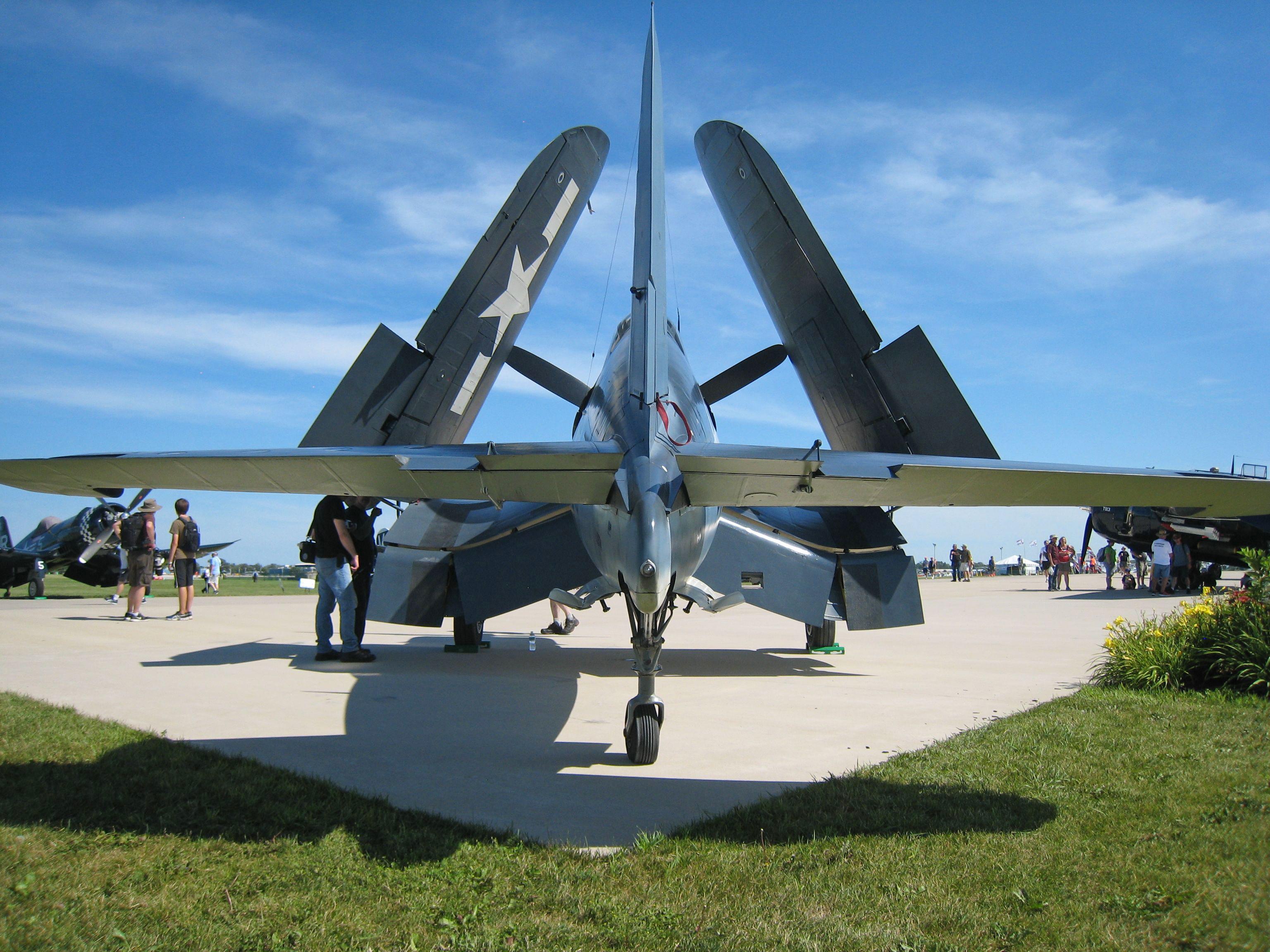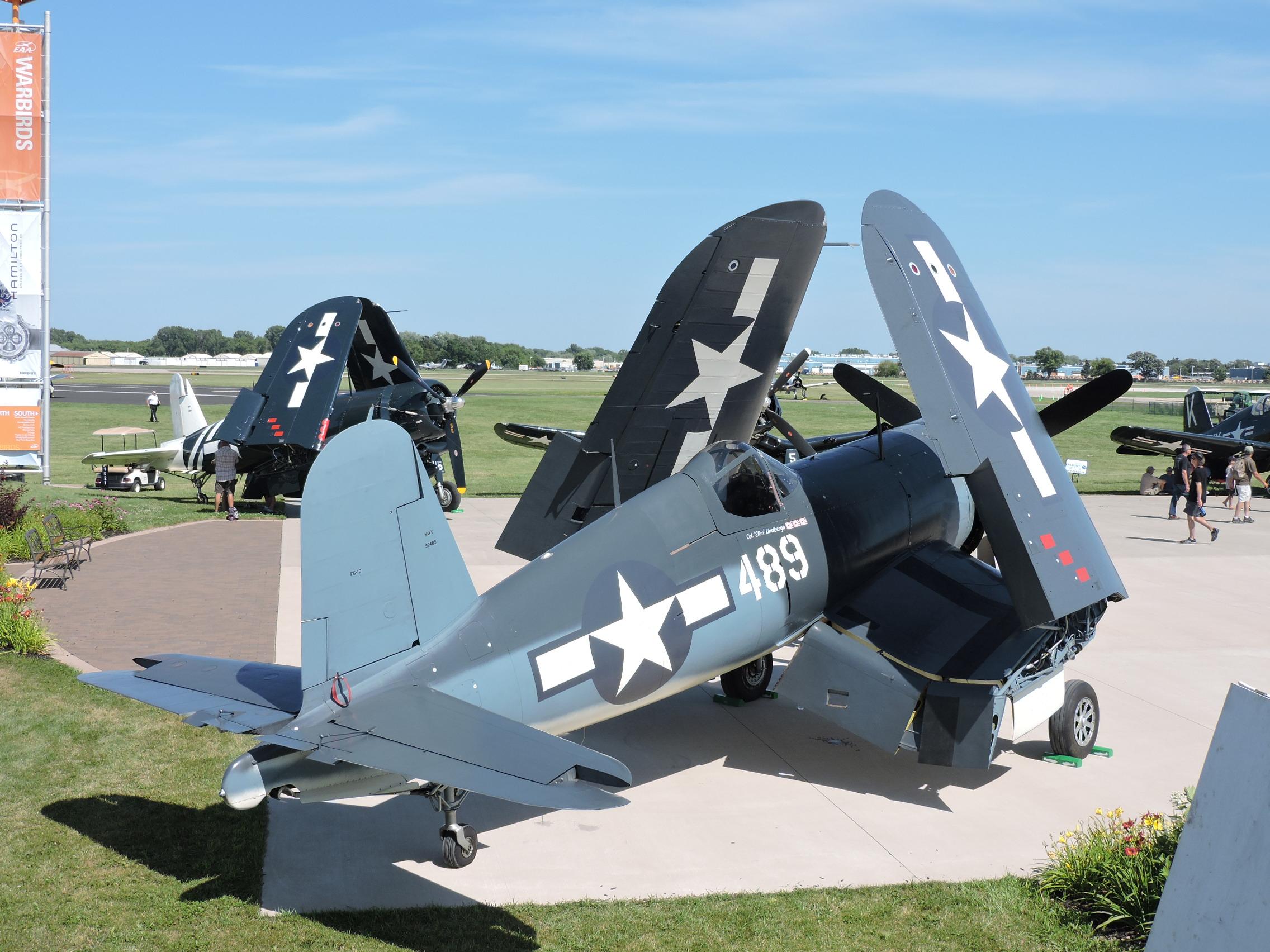 The gull-winged F4U Corsair fighter shows its wing-folding features. By Sunday, there were no fewer than four of the WWII fighters here at Oshkosh.
