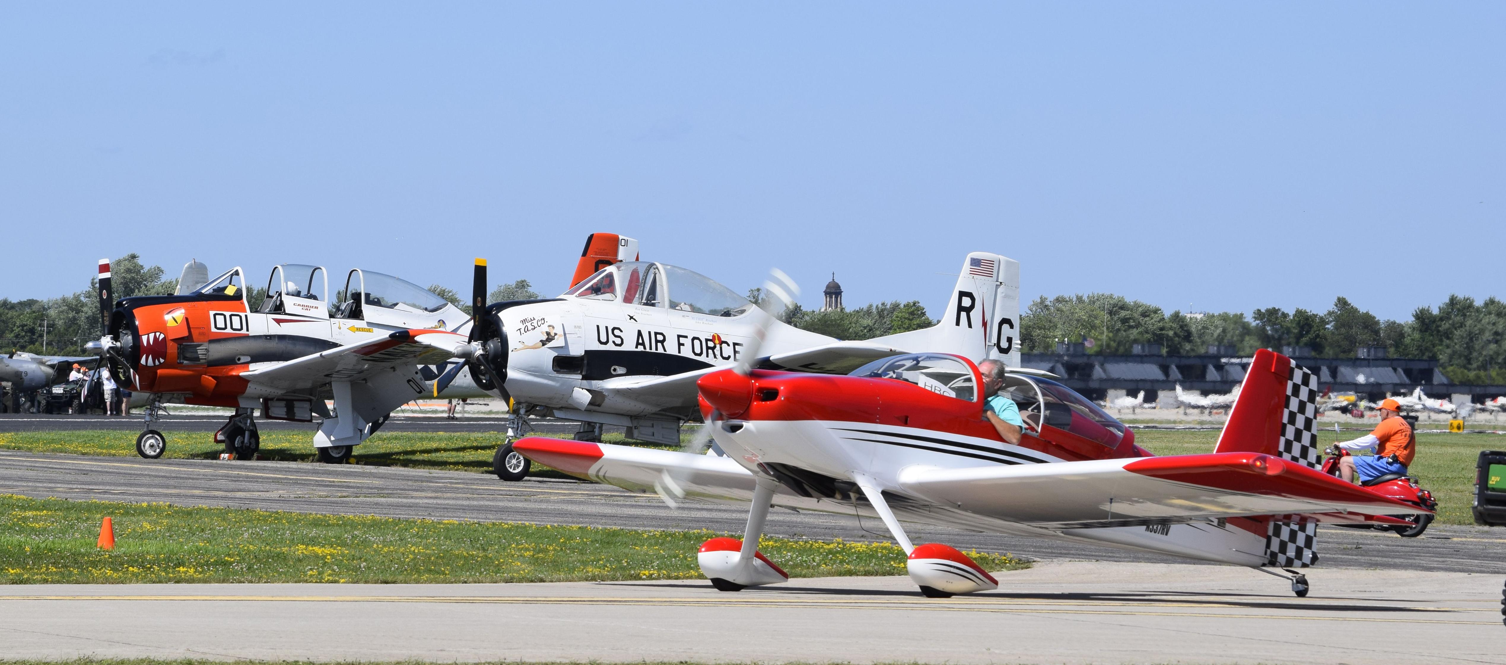 An RV-7 from Texas taxies past two warbird T-28 trainers. Many regards the RV series of homebuilt sportplanes as their personal fighters, so spritely is their performance.