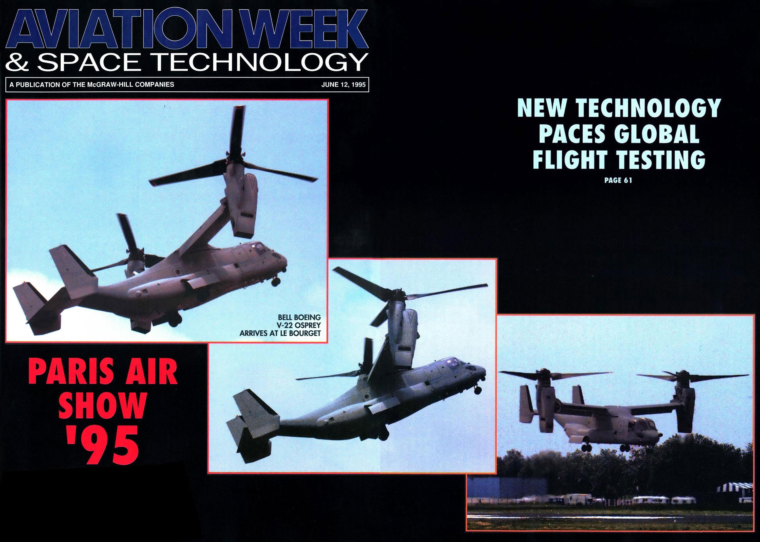 Bell Boeing V-22 Osprey flies in its first visit to a Paris Air Show. The V-22 is part of a U.S. military display that includes the Bell XV-15 tilt-wing prototype and a McDonnell Douglas B-17. The Northrop Grumman B-2 was also slated to appear.