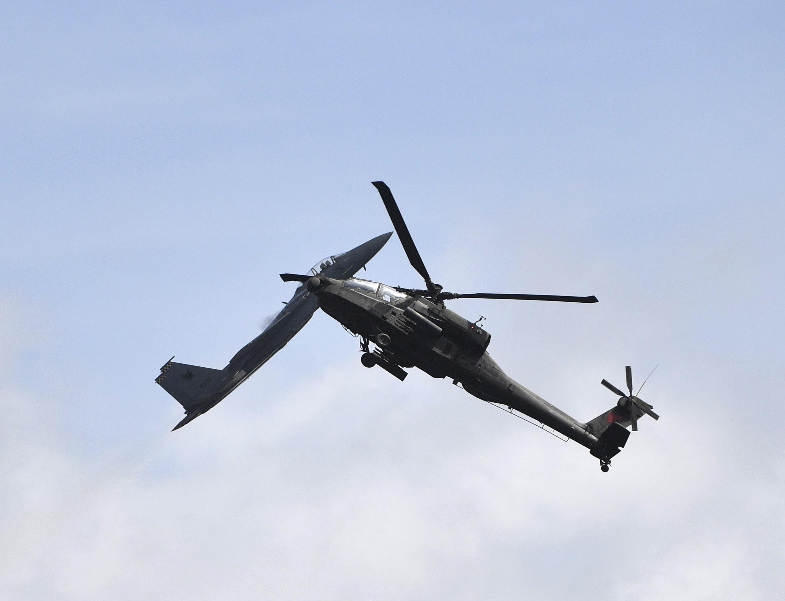 A Republic of Singapore Air Force F-15SG (left) and AH-64D (right) virtually cross paths at a high angle of attack during an airshow rehearsal on Feb. 7 at Changi Airport.