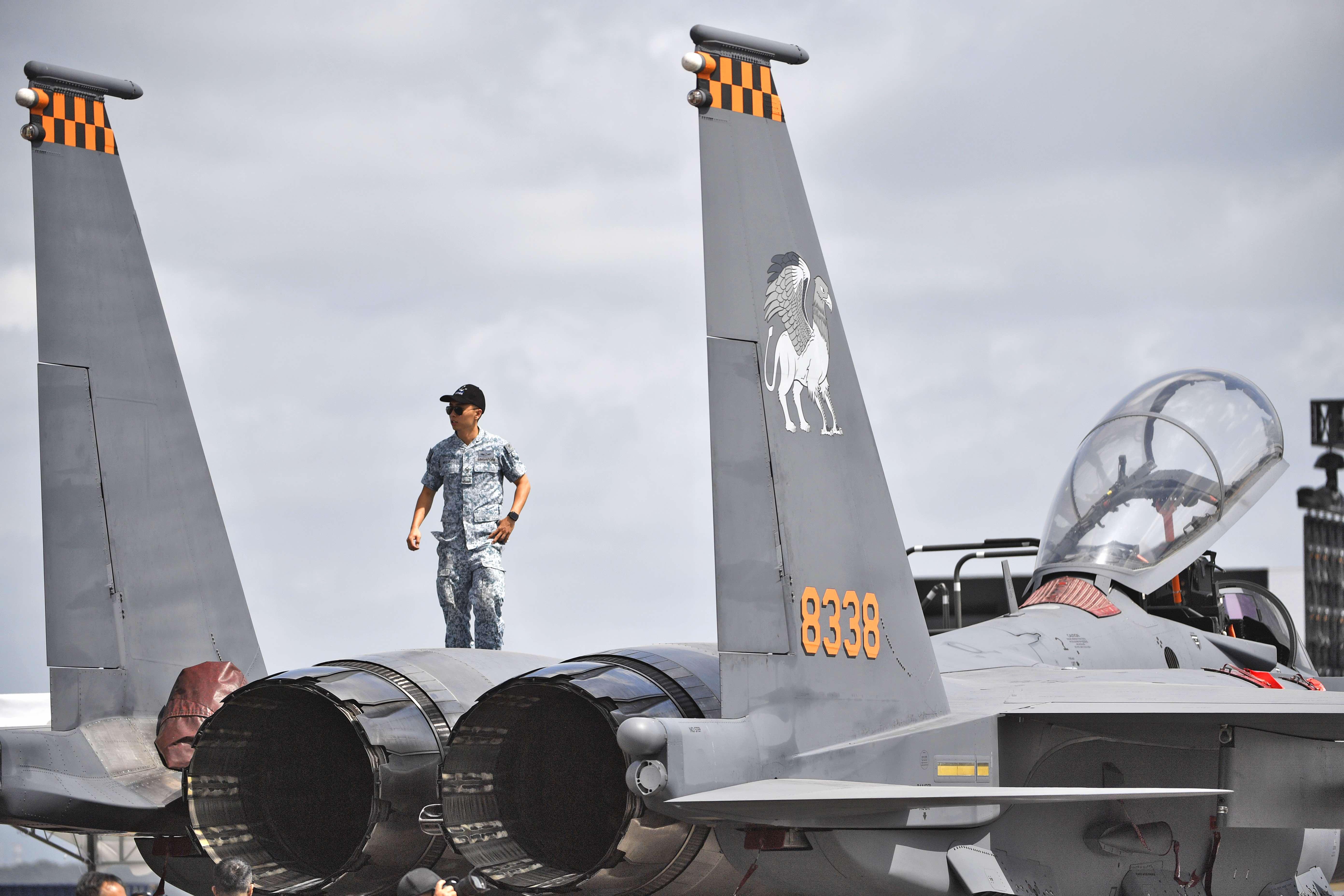 An airman performs a last inspection on a Republic of Singapore Air Force F-15SG assigned to 142 Squadron based at Paya Lebar Air Base.
