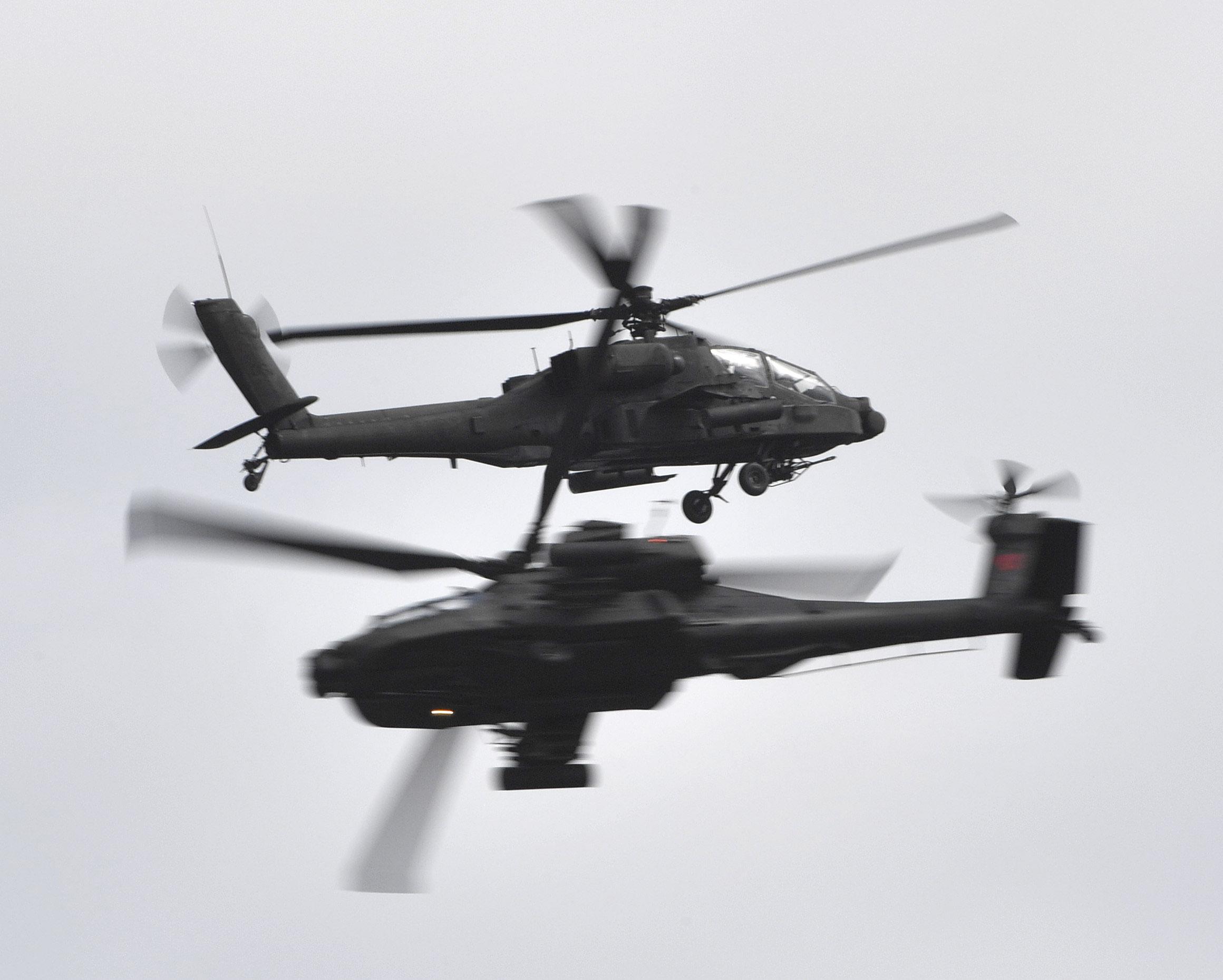 Two Republic of Singapore Air Force AH-64Ds perform an opposition pass during a Feb. 7 airshow rehearsal at Changi Airport.