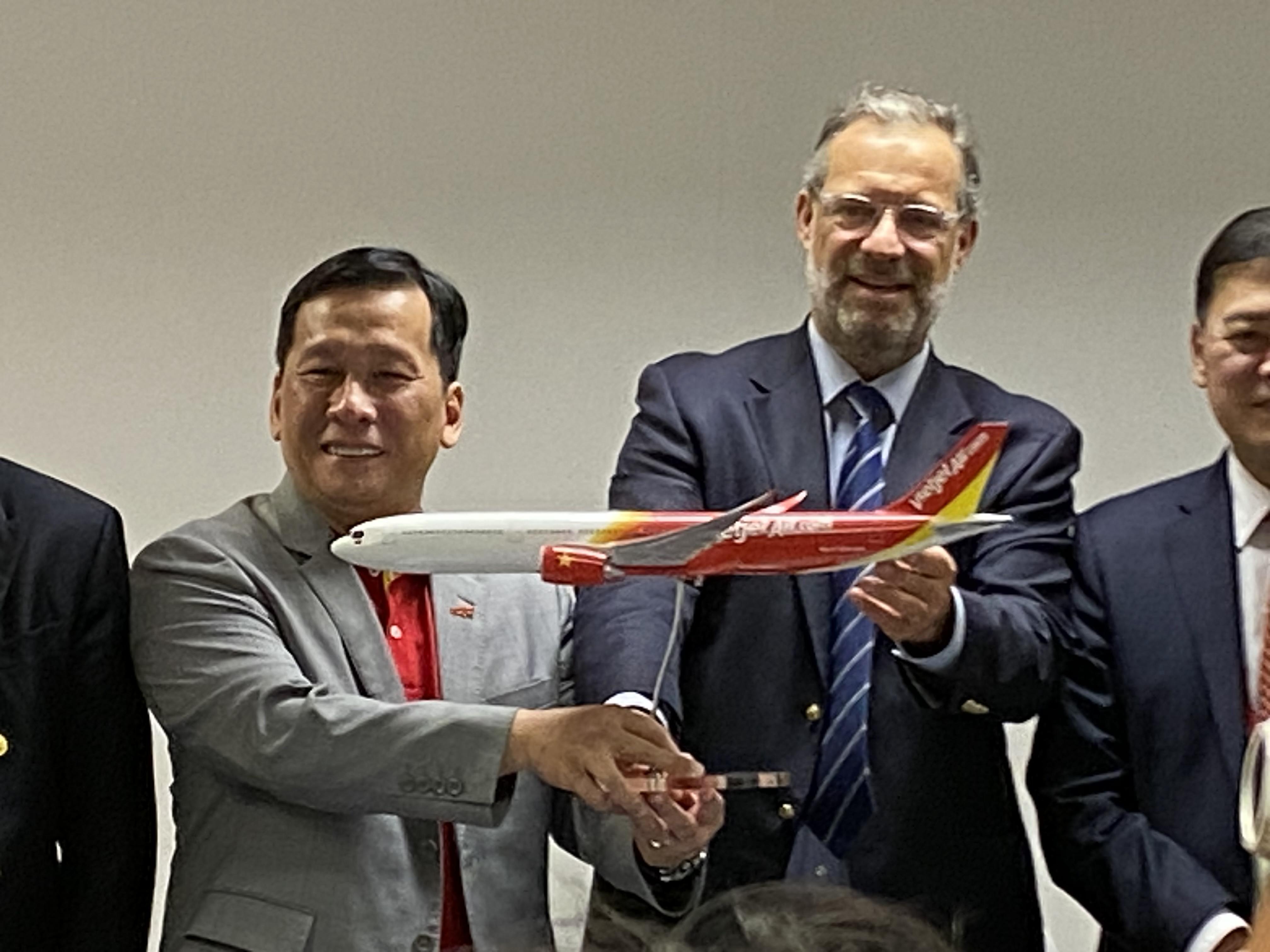 Vietjet CEO Dinh Viet Phuong (left) and Benoit de Saint-Exupery, Airbus Commercial's sales chief.
