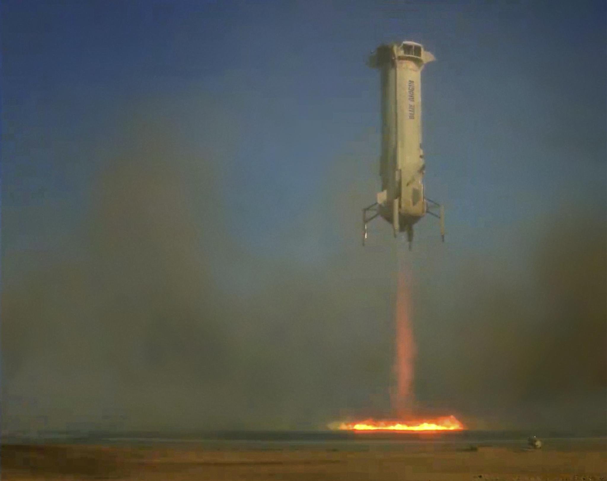 After a 10-month hiatus, Blue Origin on Oct. 13 resumed flight testing of its reusable New Shepard suborbital space transportation system. New Shepard’s liquid hydrogen- and liquid oxygen fueled-BE-3 ignited at 9:36 a.m. EDT/8:36 a.m. local time from Blue Origin’s West Texas spaceport. Credit: Blue Origin