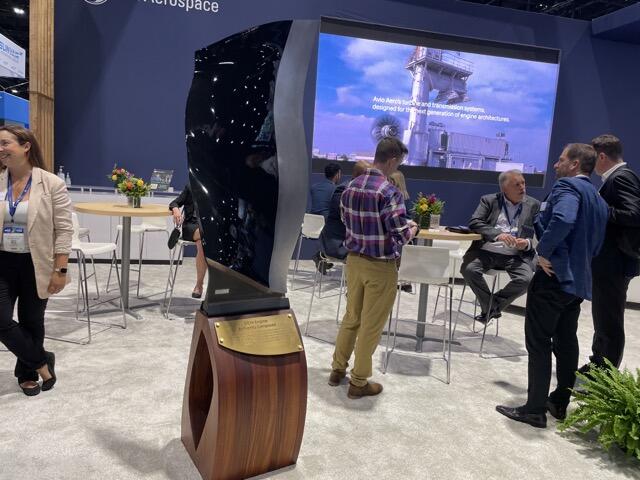 GE Aerospace (booth 2814) has taken a single blade from its GE9X engine. The statue has an embossed note which reads: "Fourth generation carbon fiber composite materials make fan blades more lightweight and durable than traditional metal. Proven on the GE90, the GE9X utilizes just 16 composite blades surrounded by a composite fan case and is just one of the many unique technologies shaping the future of aviation."