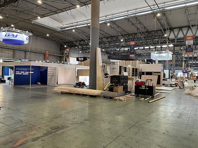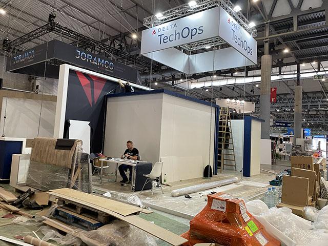 Delta Tech Ops (booth #6016), situated next to Joramco (booth #7026) are neighbors at MRO Europe 2024. The pair are knee-deep in set-up paraphernalia, flooring, ladders, boxes and bottles of water to keep the contractors hydrated.