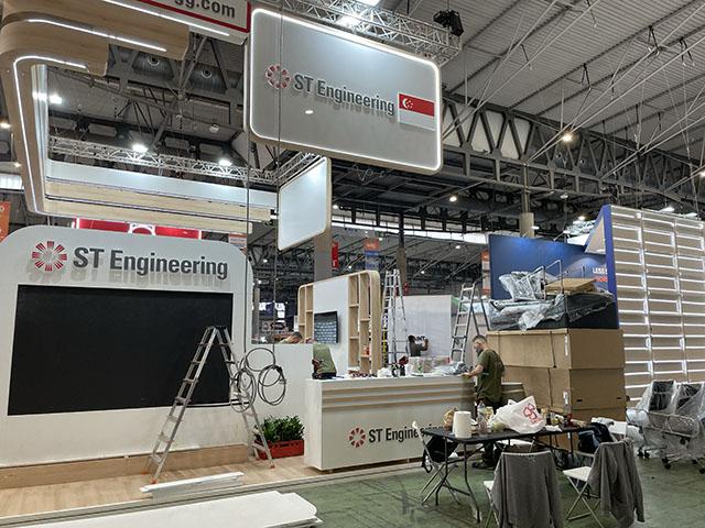 ST Engineering, (booth #7150) looks almost set. Time is tight setting up the booths and the team of contractors work tirelessly on rewiring wires and ensuring the booth aesthetics are on point.