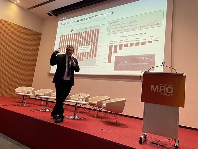 Director of Fleet Data Services, Daniel Williams, paced the floor sharing slides about fleet and engine retirement projections with data from Aviation Week's 2025 Fleet & MRO Forecast.