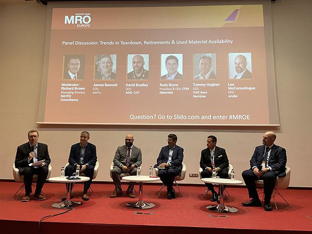 From left to right, the session's moderator, Richard Brown, managing director of NAVEO Consultancy; James Bennett, COO of AerFin; David Bradley, CEO of AOG-247; Rudy Bryce, president and CEO of CFM Materials; Tommy Hughes, CEO of VAS Aero Services; and Lee McConnelloogue, CEO of ecube.