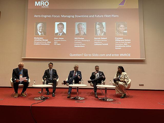 The last panel of the day talked about managing downtime and future fleet plans, with an aero-engine focus. From left to right: Jonathan Berger, managing director of Alton Aviation Consultancy; Alan Jones, executive director of MRO at ITP Aero; Will Pitcher, SVP of sales, marketing and customers for airlines and fleets at StandardAero; Derrick Siebert, VP of engine services operations at Lufthansa Technik; and Praveeni Witharana Nelson, team and fleet manager for powerplant at SAS.
