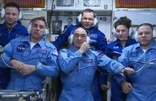 Credit: ASA astronaut Chris Cassidy, along with Anatoly Ivanishin and Ivan Vagner of the Russian space agency Roscosmos join Expedition 62 Commander Oleg Skripochka of Roscosmos and NASA astronauts Andrew Morgan and Jessica Meir aboard the ISS