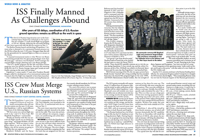 Our journalist Craig Covault reported in the Nov. 6, 2000 issue of Aviation Week & Space Technology how, after years of International Space Station (ISS) delays, the project was finally manned, and, despite coordination of U.S.-Russian ground operations, remains as difficult as the work in space.