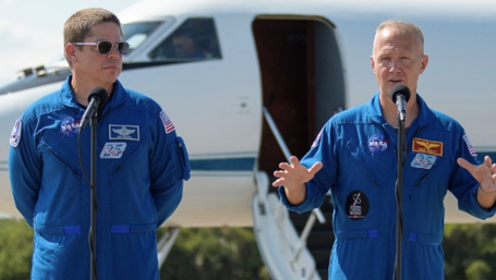 NASA astronauts Robert Behnken and Douglas Hurley landed at Kennedy Space Center in Florida on May 20 for final preparations ahead of launch next week to test SpaceX’s Crew Dragon system.