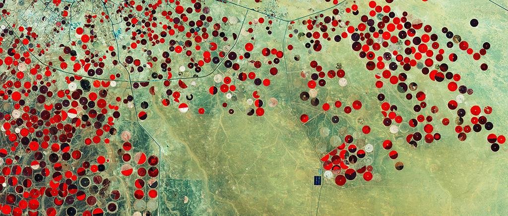 This image from Sentinel-2A shows how Saudi Arabia’s desert is being used for agriculture. The circles come from a central-pivot irrigation system, where a long water pipe rotates around a well at the center.