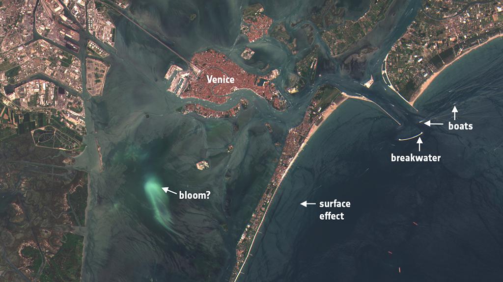 Acquired July 4, 2015, over Italy’s Venice lagoon, this image from Sentinel-2A demonstrates the mission’s ability to monitor sediment transport in coastal waters.