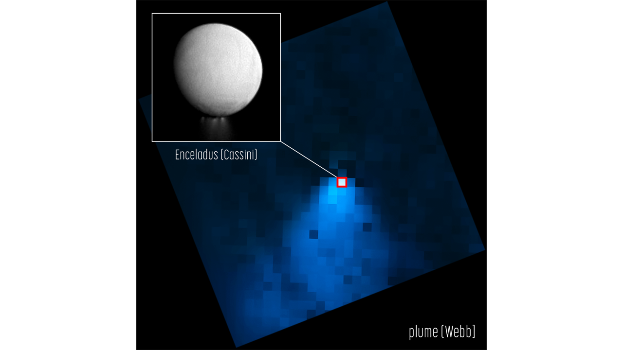 This image -- released May 30 and taken by the James Webb Space Telescope’s Near-Infrared Spectrograph, NIRSpec and NASA’s Cassini orbiter -- details a water vapor plume jetting out from Saturn's moon Enceladus. Enceladus is about four percent of Earth’s size, with a global reservoir of salty water below the moon’s outer crust. The plume spans more than 6,000 miles and is about 20 times the size of Enceladus, which is appears as a small dot on the NIRSpec image. Thirty percent of the water in the plume stays within a donut-shaped torus surrounding Saturn, while the other 70 percent supplies the rest of the Saturnian system with water by escaping the torus.