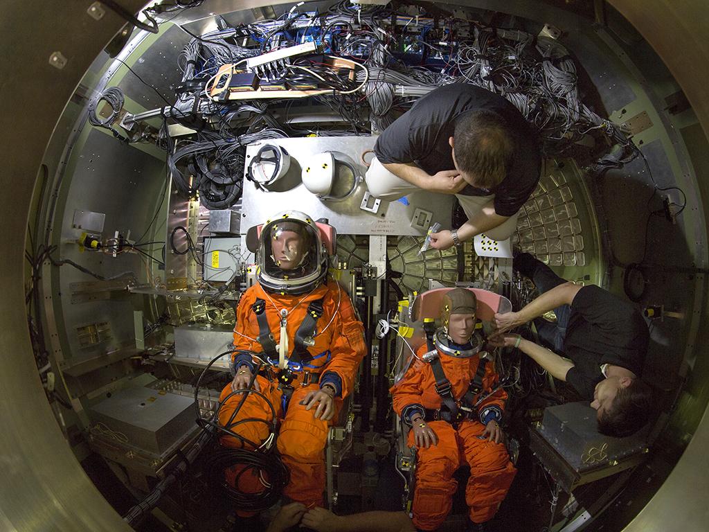 Test dummies are strapped inside the Orion Ground Test Article for upcoming splash down testing at Langley Research Center's Hydro Impact Basin.