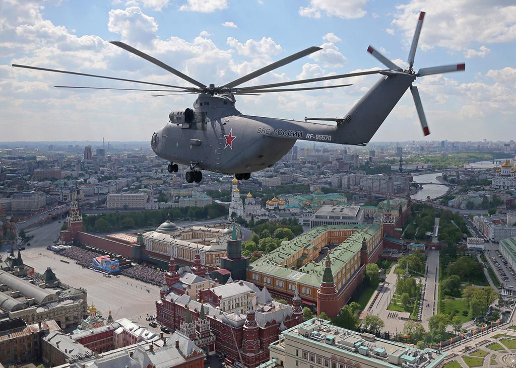 A Russian air force helicopter heads toward Moscow’s Red Square.