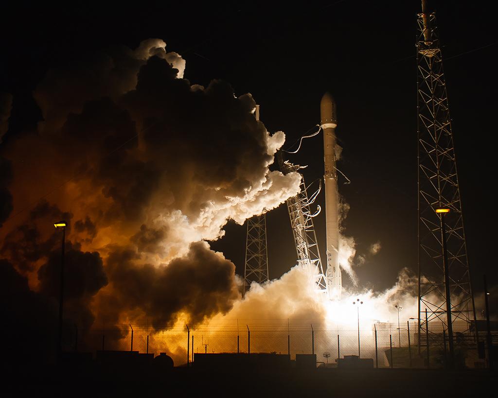 The December 2015 launch of Orbcomm OG2-M2 was the first for SpaceX's upgraded Falcon 9 "full-thrust" variant, making use of densified propellants to improve rocket performance. Cape Canaveral AFS, Florida.