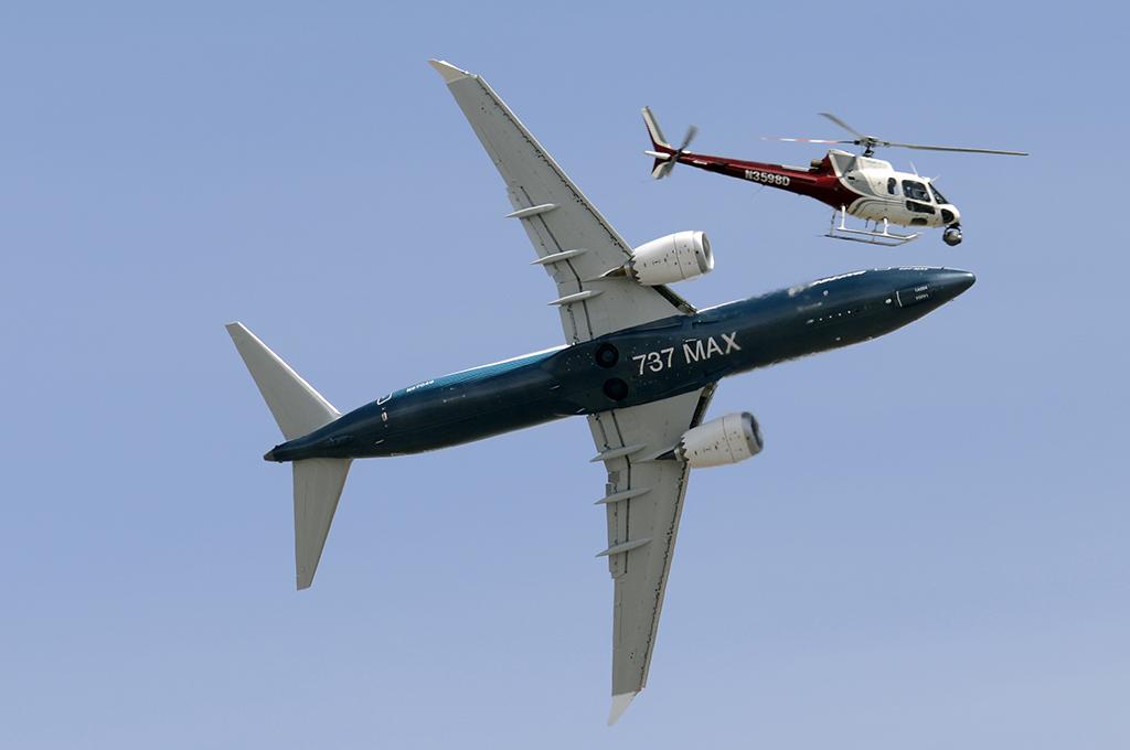 A helicopter serves as the platform for photographing a Boeing 737 MAX.