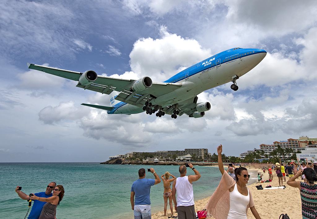 A KLM Asia 747 passes over Paradise Beach on final approach to Princess Juliana International Airport, St. Maarten.