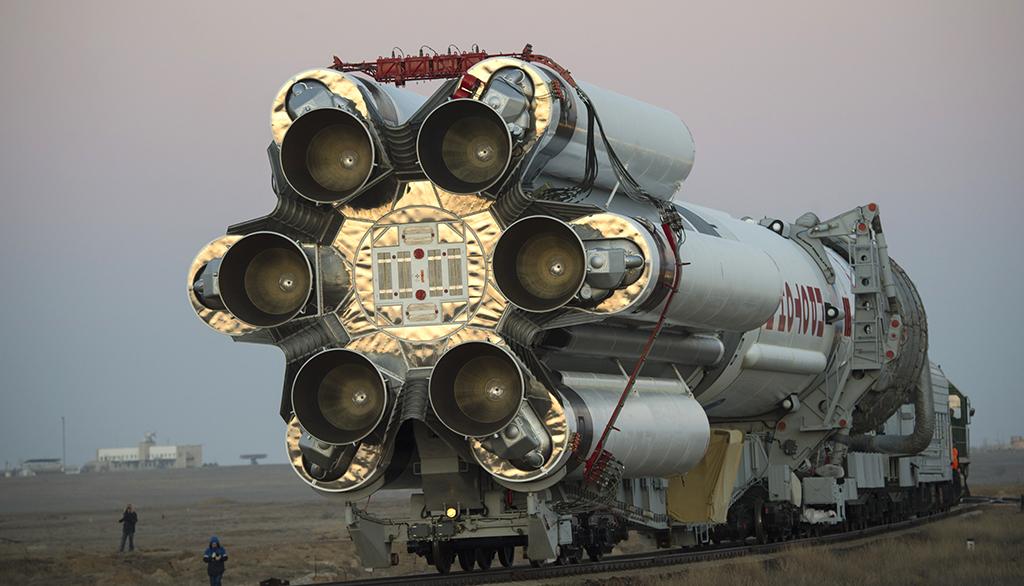 A Proton booster rolls out from the fueling station to Pad 200 on March 11 at Baikonur Cosmodrome, Kazakhstan.