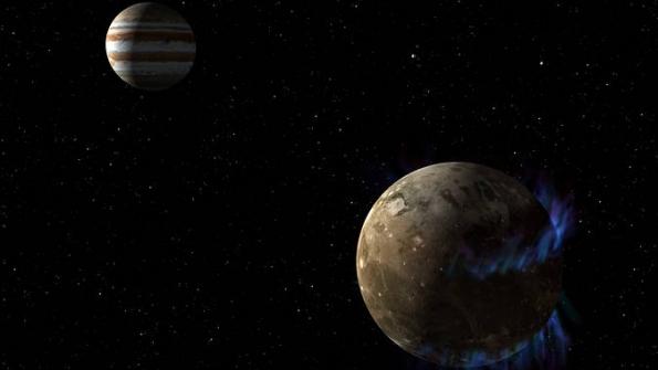 The moon's magnetic field is responsible for glowing aurora at Ganymede's north and south poles. At the same time, Ganymede is close to Jupiter's own dynamic magnetic field. When Jupiter's magnetic field changes, the aurora on Ganymede rock back and forth.