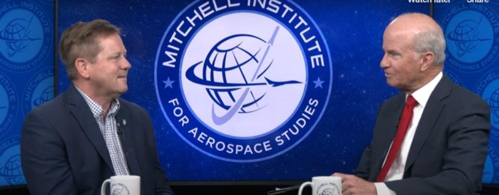 Space Rapid Capabilities Office Director and PEO Kelly Hammett (L) speaks with U.S. Air Force Gen. (ret.) Kevin Chilton, explorer chair, at the Mitchell Institute Spacepower Advantage Center of Excellence on June 24.