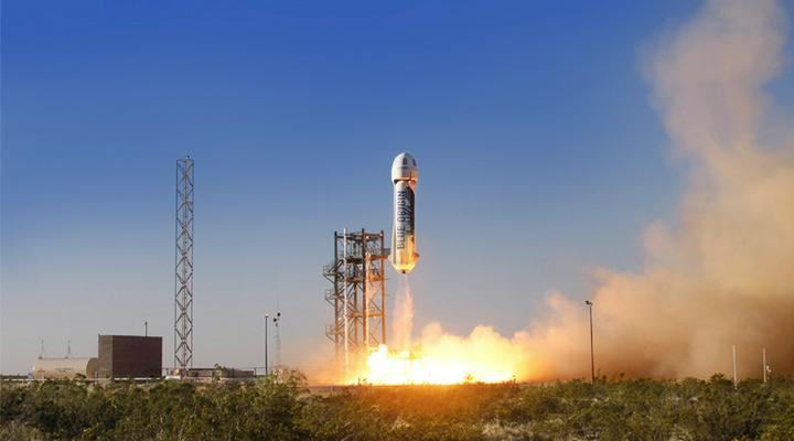 Blue Origin’s New Shepard reusable suborbital rocket made its first development flight on April 29, the company’s 110,000-lb.-thrust BE-3 liquid-oxygen/liquid-hydrogen engine powering the unmanned vehicle to 307,000 ft. and separation of the crew capsule, which returned to a parachute landing. The second test flight on Nov. 23 ended in the first successful vertical landing of the reusable single-stage booster.