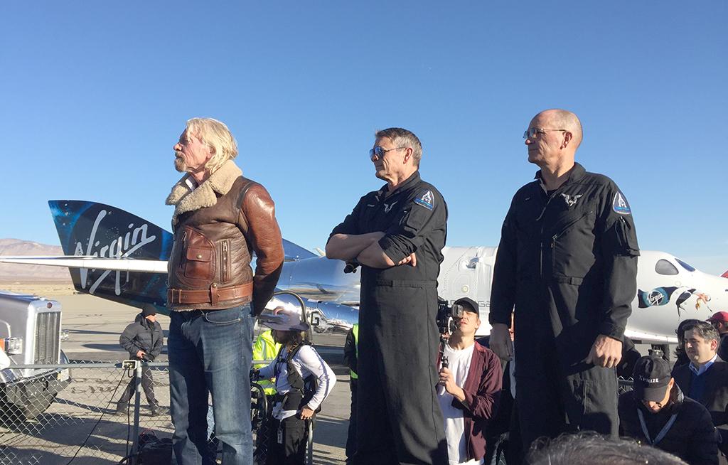 Richard Branson (from left) and pilots Mark “Forger” Stucky and Frederick “CJ” Sturckow stand in front of Virgin Galactic’s SpaceShipTwo Unity after the Dec. 13 flight.