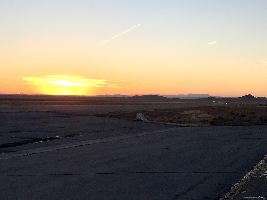 With its lights barely visible against the glow of the predawn sky, Virgin Galactic’s Unity is prepared for takeoff beneath the WhiteKnightTwo (WK2) carrier aircraft at the southeast end of Mojave Air and Space Port’s 9,500-ft.-long Runway 12-30.