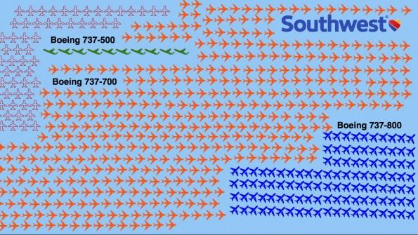 Famous for its all-Boeing fleet, Southwest's fleet has grown dramatically over the past 10 years. In 2006, the airline had three types of aircraft: 194 Boeing 737-300s, 25 Boeing 737-500s and 232 Boeing 737-700s - totaling a 451-aircraft fleet. In the past decade, the fleet has grown by 261 aircraft...