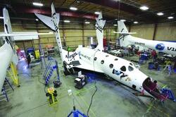 Technicians at Scaled Composites have feathered the tail structure of the Virgin Galactic SpaceShipTwo suborbital spaceplane as its assembly continues at the company’s facility in Mojave, Calif. Like its Ansari X-prize-winning prototype, the commercial launch vehicle will fly to space from its...