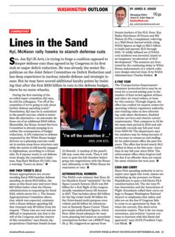 As an aerospace engineer by training and a retired, conservative manufacturing executive, I was appalled by Sen. Jon Kyl's (R.-Ariz.) comment in “Lines in the Sand” (AW&ST Sept. 12, p. 23): “I'm off of the committee if we're going to talk about further defense spending [cuts].” Having just endured...