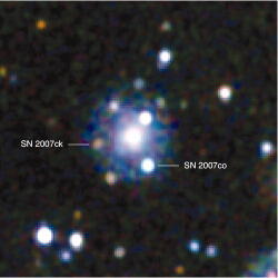 Researchers using NASA's Swift gamma-ray burst satellite have spotted two supernovae that exploded in the same galaxy only 16 days apart, an "extremely rare" coincidence. This combination of red, green and blue images of the galaxy MGC +05-43-16, taken June 9 and 12, shows the two events. First seen...