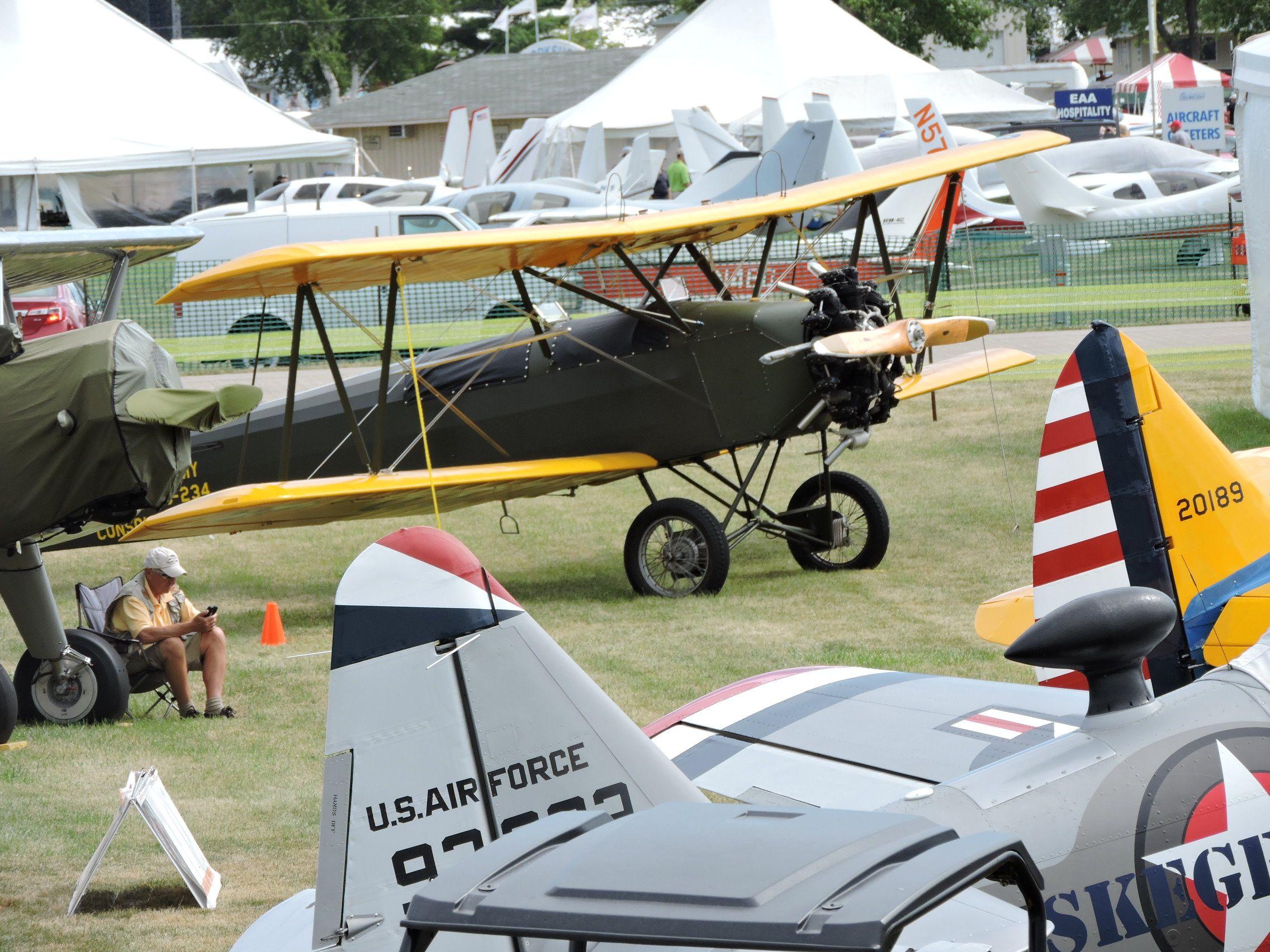The trainer display in the Warbirds area features many aircraft. In the foreground here is a U.S. Army Consolidated PT-3 Husky, one of only three in existence.