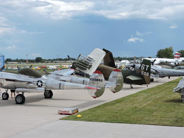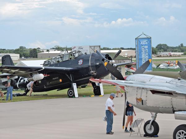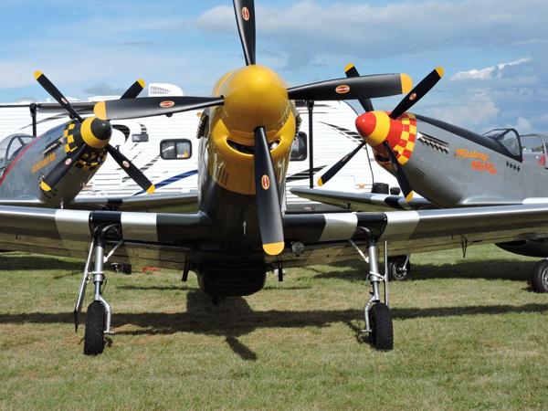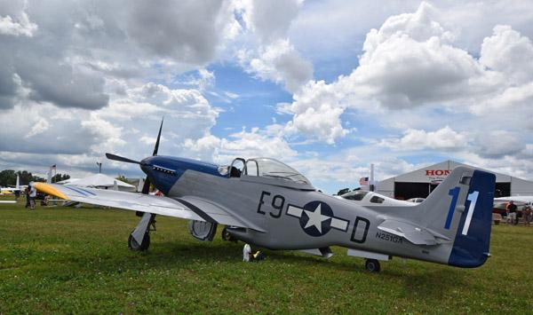 A trio of Titan Aircraft P-51 replicas parked near the Warbirds area. The one on the right, ‘Mustang Mama,’ was built by Barbara Bergstrom, granddaughter of the founder of Weldon Aerospace. “Getting insurance was tough for a 79-year-old pilot flying a kitplane,” she says.
