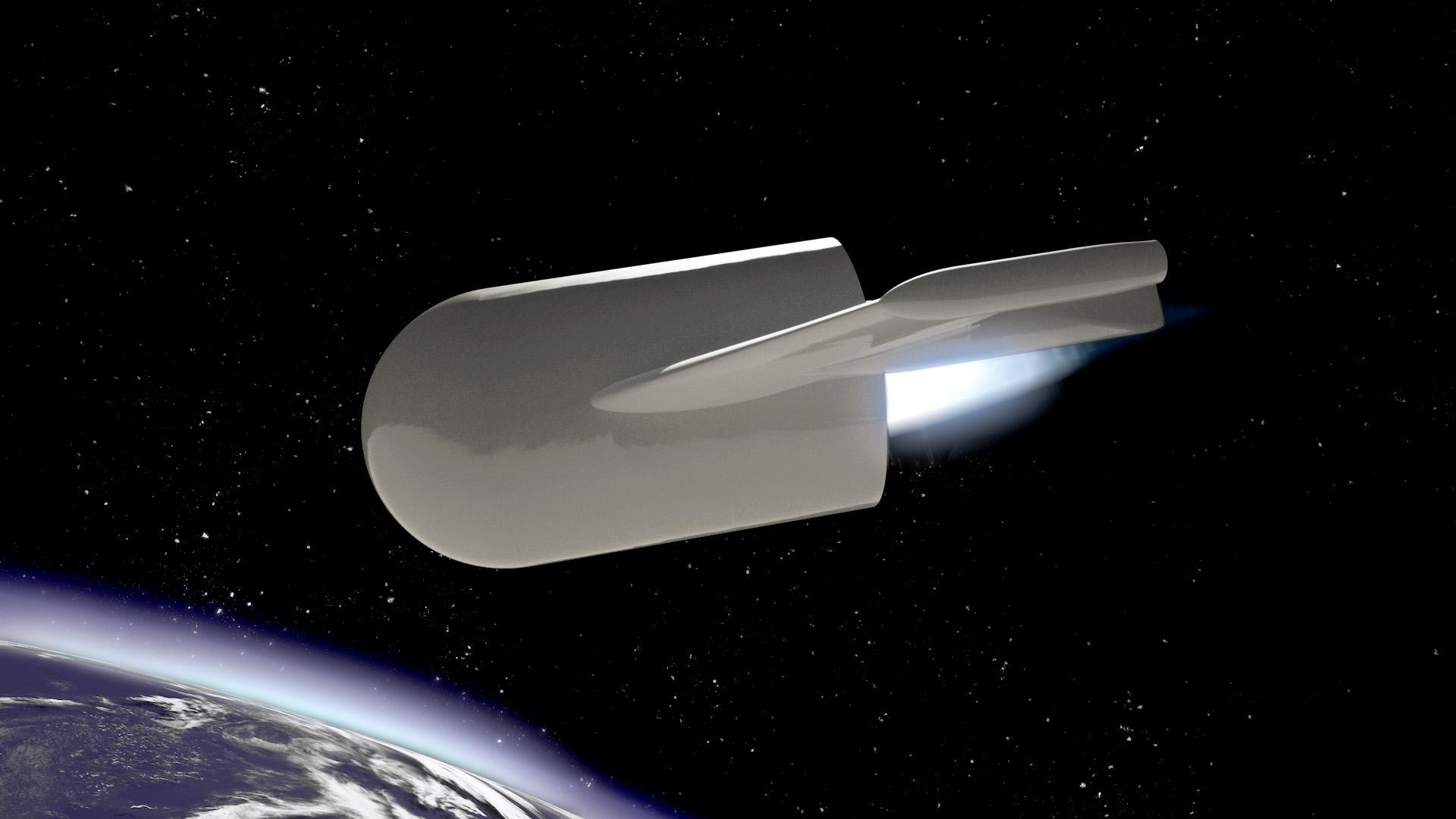 Airbus Defense & Space is developing a reusable booster concept, Adeline, for launches in 2025 or beyond. The first-stage rocket motor is in a winged module that separates from its tank, reenters, deploys propellers and flies back under turboprop power to a remotely piloted runway landing.
